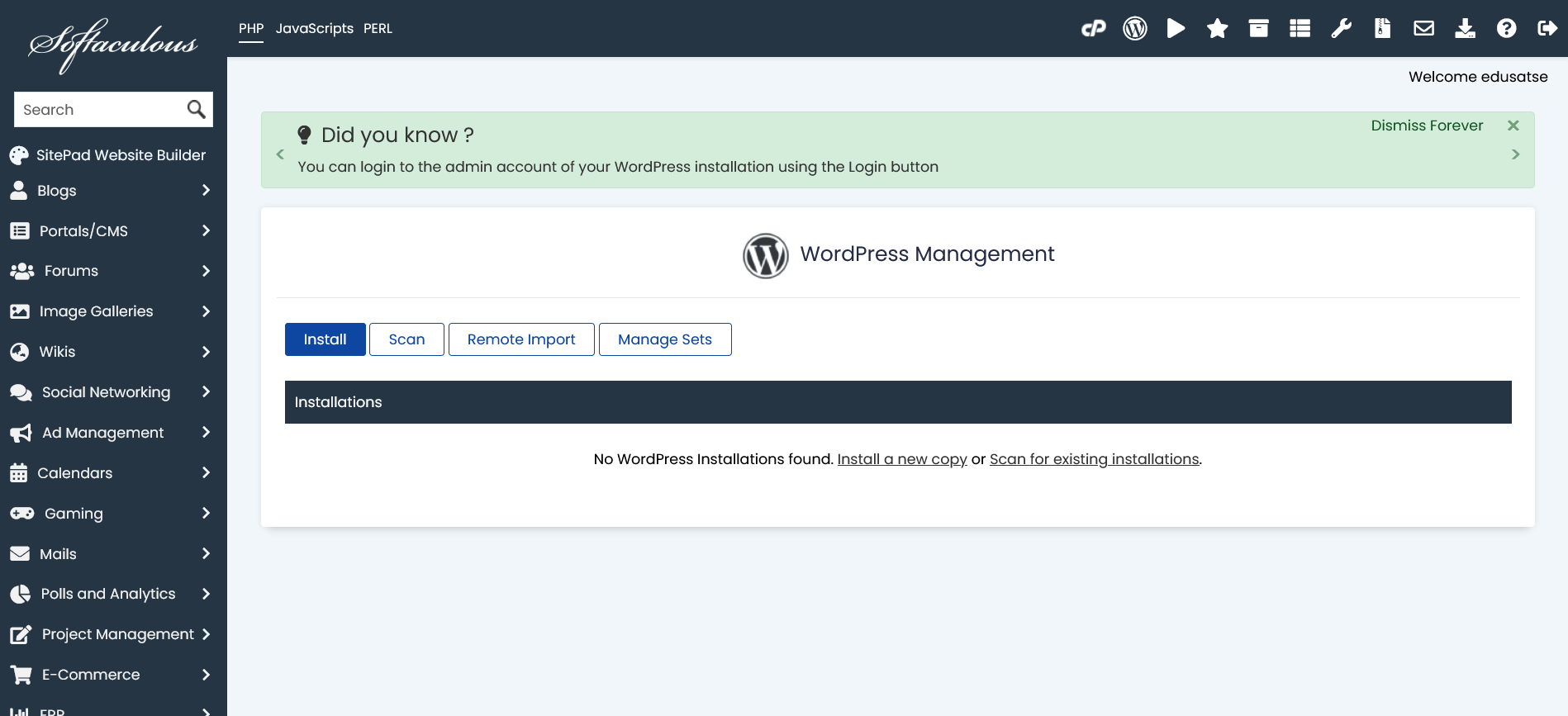 خب همان طور که مشاهده می کنید در ساید بار سمت چپ WordPress Manager by Softaculous فعال می باشد، سپس وارد این بخش شوید.