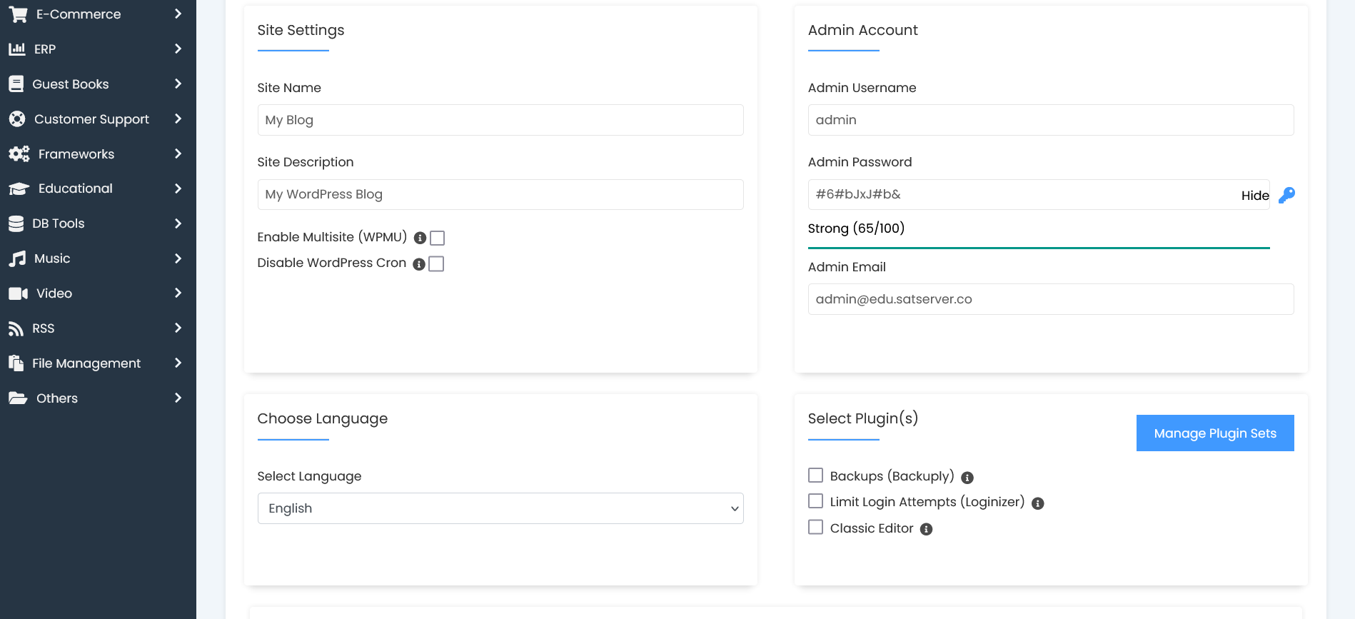 Admin Password: رمز عبوری برای ورود به داشبورد وردپرس وارد نمایید (پیشنهاد شده روی آیکن کلید کلیک کنید تا رمز قوی تولید شود)