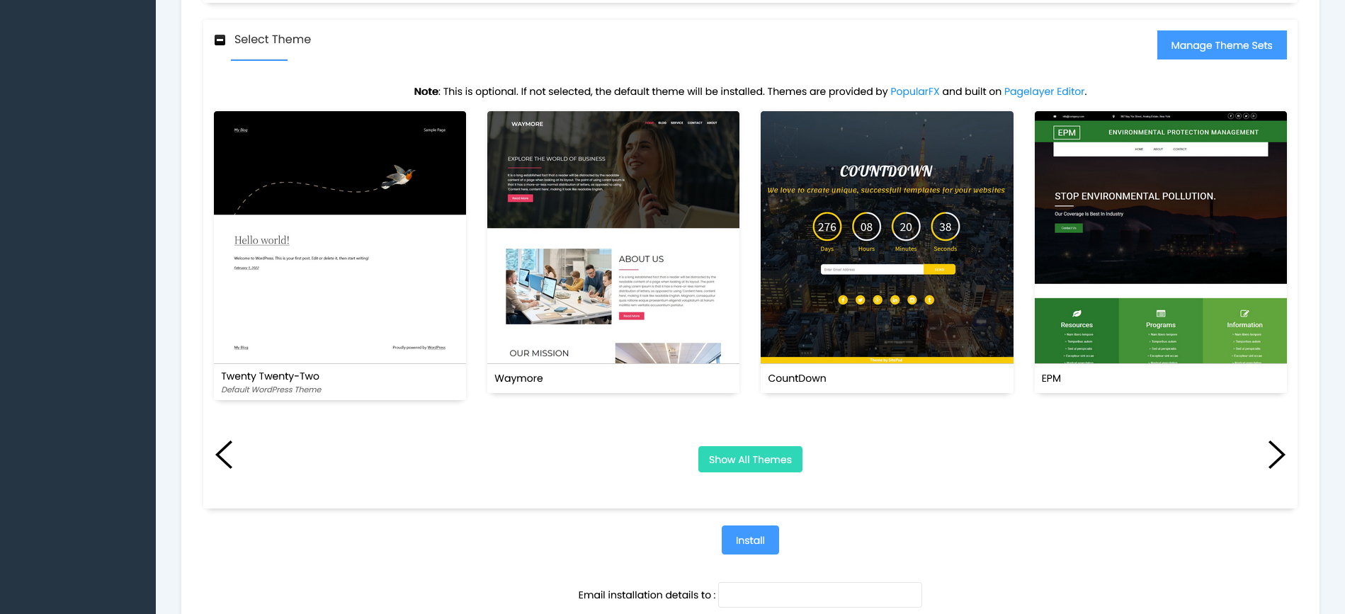 توجه: این بخش اختیاری است. اگر انتخاب قالبی انتخاب نشود، تم پیش فرض نصب خواهد شد. تم ها توسط PopularFX ارائه شده و بر روی صفحه ویرایشگر ساخته شده اند.